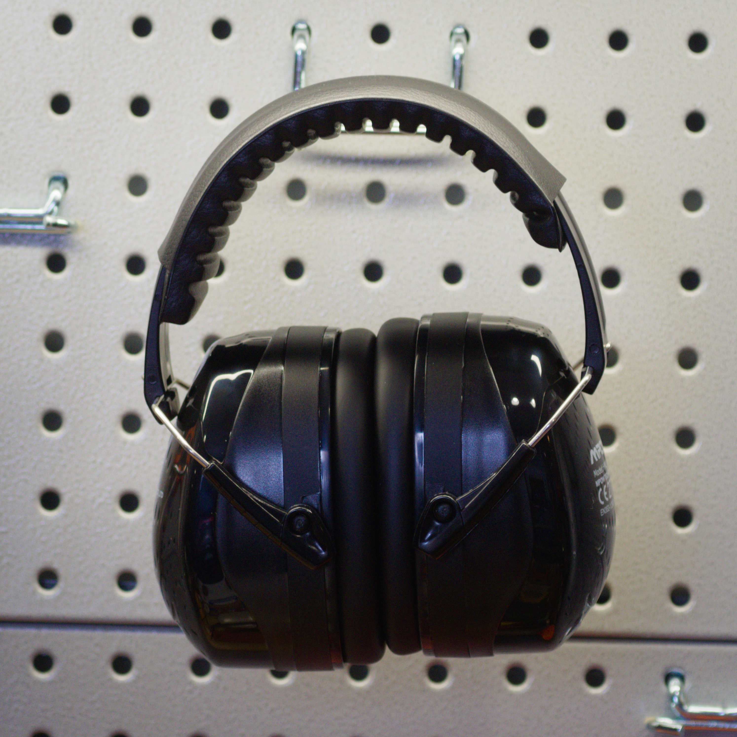 Once the glue and goop are dry, it's time to add hardware, then foam. Foam dampens sound - absorbs the pressure wave, stopping sound from reflecting off the back of the cup. I'm using safety earmuffs for the headband, and it also comes with foam. These are cheap and quite sturdy, making this pretty effective.