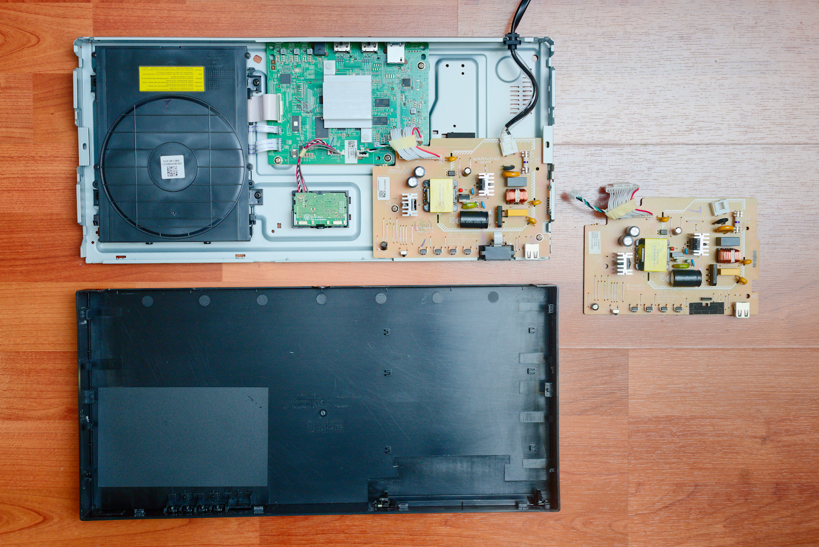 Looking at the device opened up - There are only a couple of boards. the power cable plugs into the brown power module. The green board drives the disc.